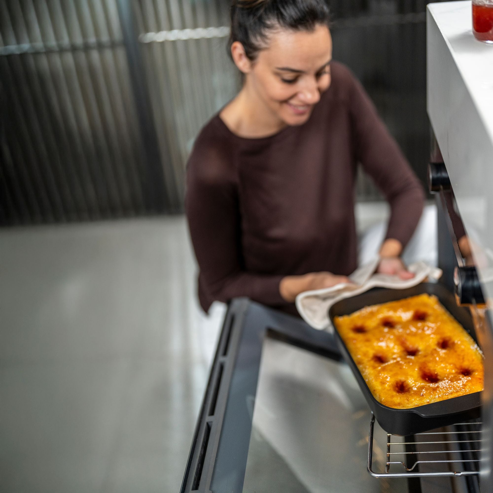 Le teglie da forno Guzzini sono realizzate in fusione di alluminio ad alto spessore, garantendo resistenza e un’eccellente distribuzione del calore su tutta la superficie, assicurando una cottura uniforme.