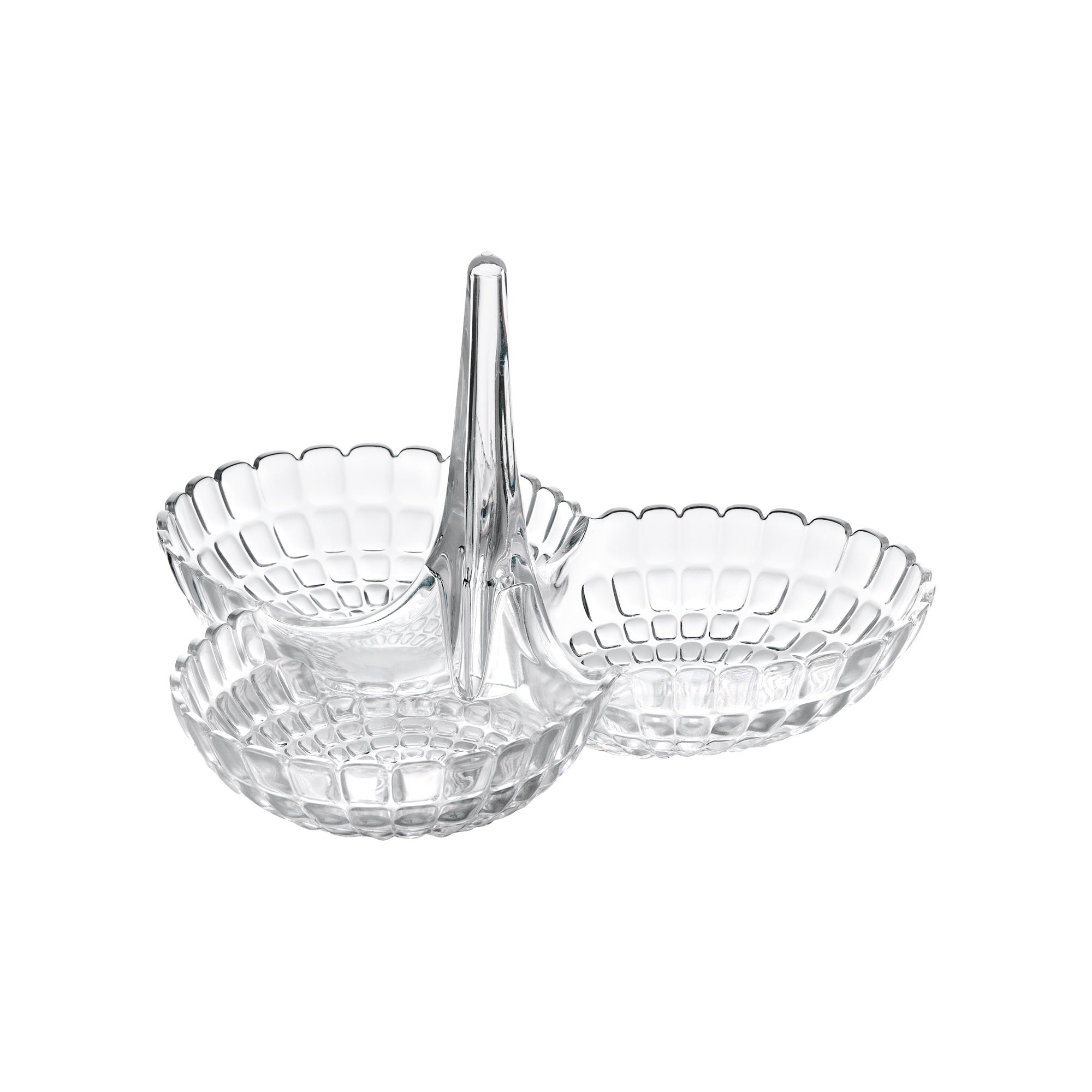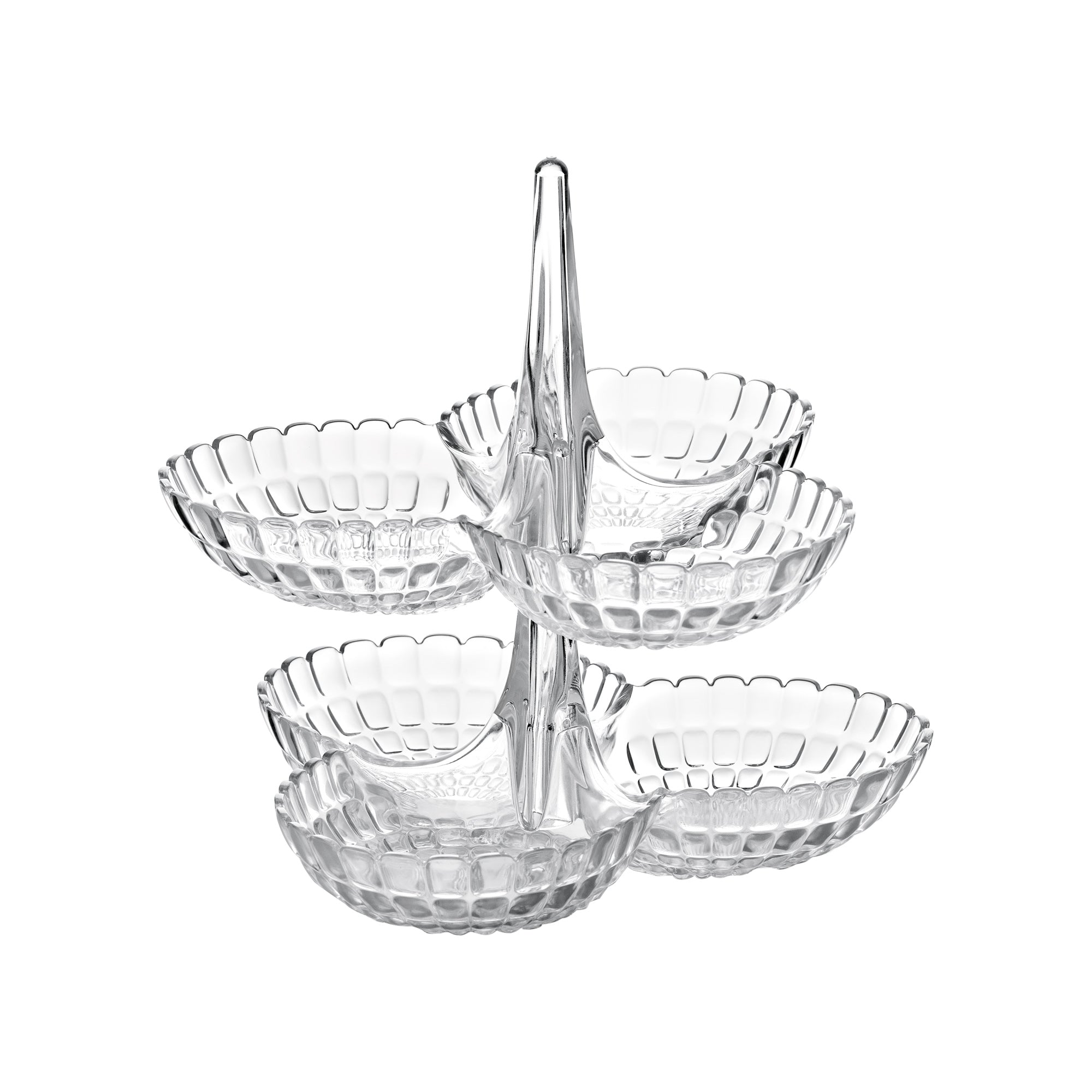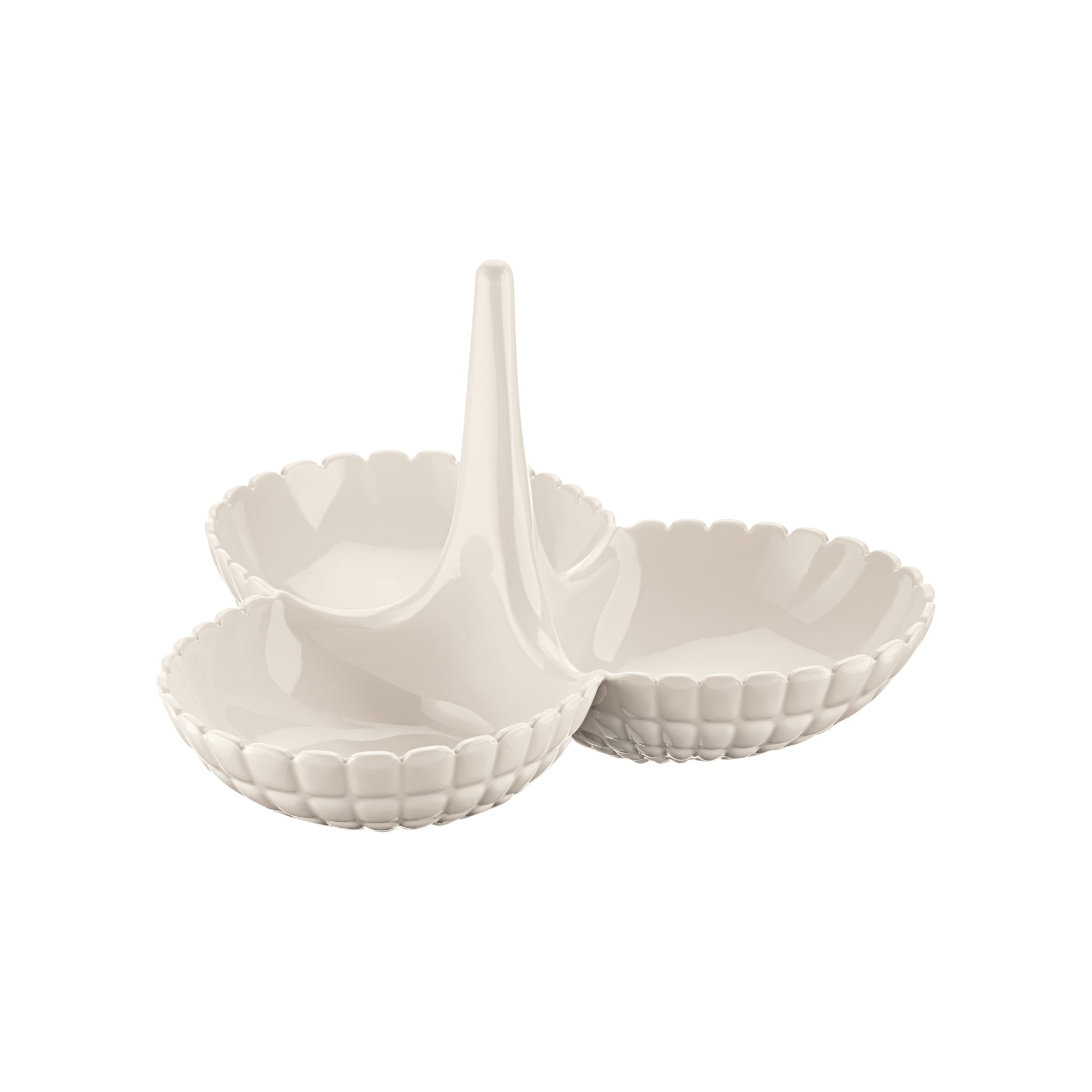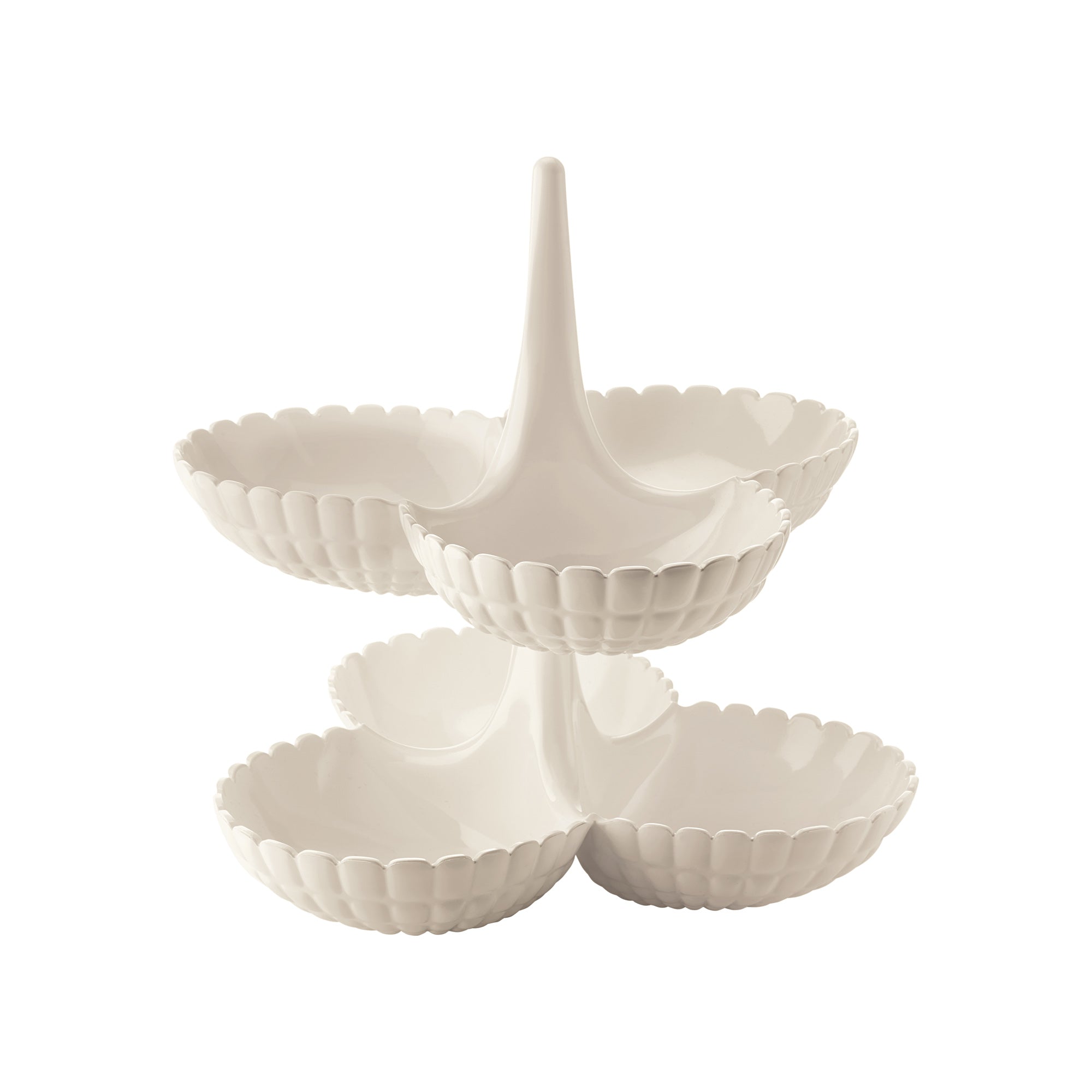 An original hors d'oeuvres dish, which can be sold either as a single piece or as two modular pieces. It comprises a vertical stand supporting three bowls designed to take crisps, pistachio nuts, peanuts and small snacks, while a special fitting system allows another hors d'oeuvres dish to be placed on top of the first, to create a six-bowl version.